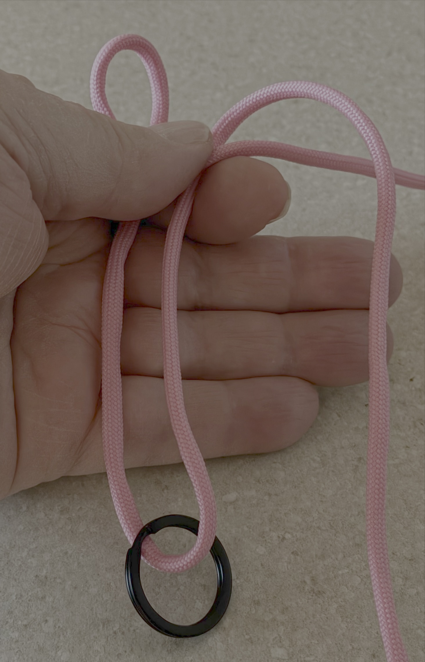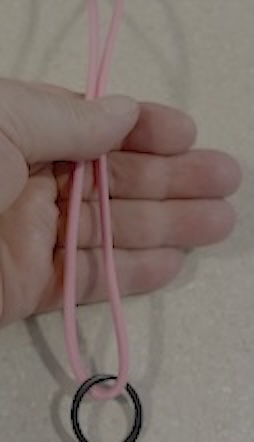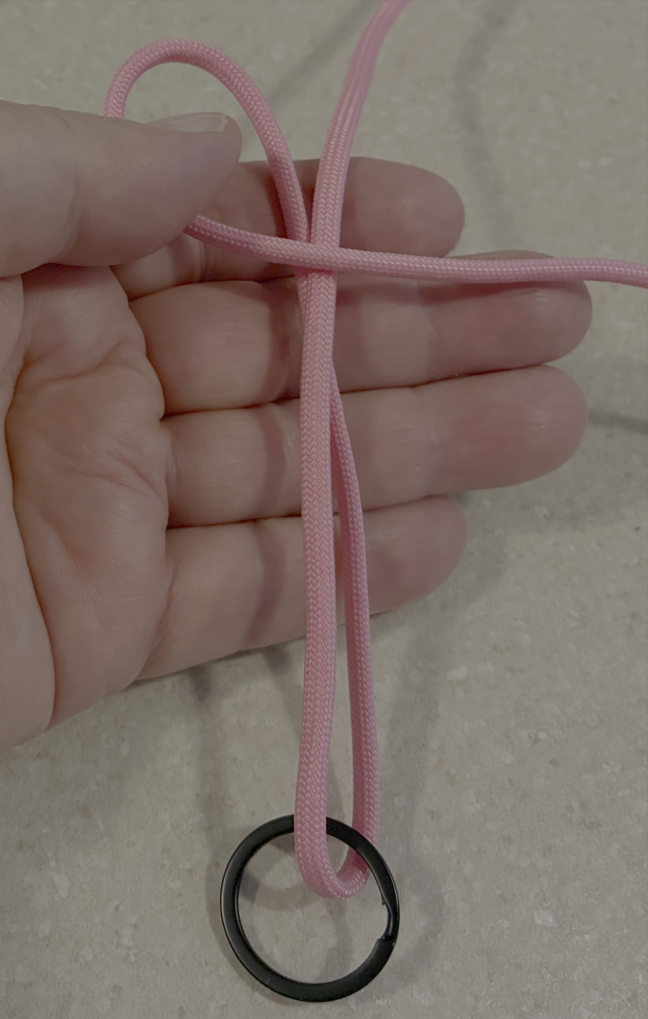 Hold both strands just above the ring. The idea is to make a fob about the width of your hand.