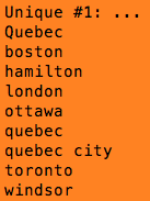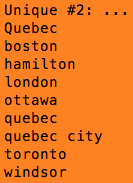 Here's a short list of cities with some duplicates thrown in. We just want the unique ones ...