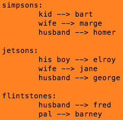 Accessing individual values is straight-forward, since the index is the key. Here we are looking for the wife's name in the jetsons family: