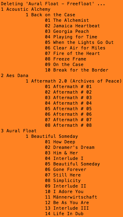 print "Deleting 'Aural Float - Freefloat' ...\n"; delete $music{'Aural Float'}{'Freefloat'}; # THAT'S IT! ($Andx,$Cndx) = (1,1); # reset counters foreach $artist (sort keys (%music)) { print "$Andx $artist\n"; $Andx++; $Cndx=1; # initialize for each artist foreach $cd (sort keys $music{$artist}) { print "\t $Cndx $cd\n"; $Cndx++; foreach $tracknum (sort keys $music{$artist}{$cd}) { print "\t\t$tracknum $music{$artist}{$cd}{$tracknum}\n"; } } }