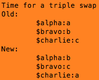 ($alpha,$bravo,$charlie) = ($bravo,$charlie,$alpha);