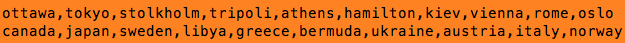 Each line has 2 fields: city, country.