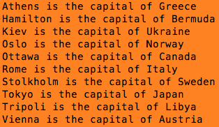 __DATA__ ottawa|canada tokyo|japan stolkholm|sweden tripoli|libya athens|greece hamilton|bermuda kiev|ukraine vienna|austria rome|italy oslo|norway