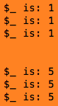 foreach (@fives) { print "\$_ is: $_\n"; }