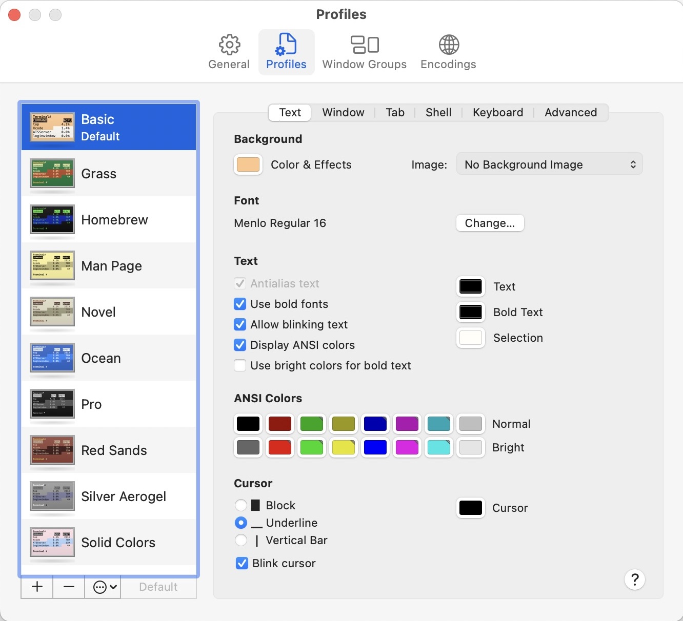 In that pane are some things you can change: Background; Font; Text; ANSI Colors; Cursor.